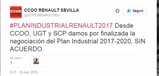 Sin embargo, según han anunciado las secciones de Comisiones Obreras de las plantas de Renault en Sevilla y Valladolid en sus cuentas de la red social Twitter (@ccoorenaultsev y @CCOOrenaultvall), los sindicatos han dado por finalizada la negociación, sin acuerdo, minutos antes de las 14.30 horas.