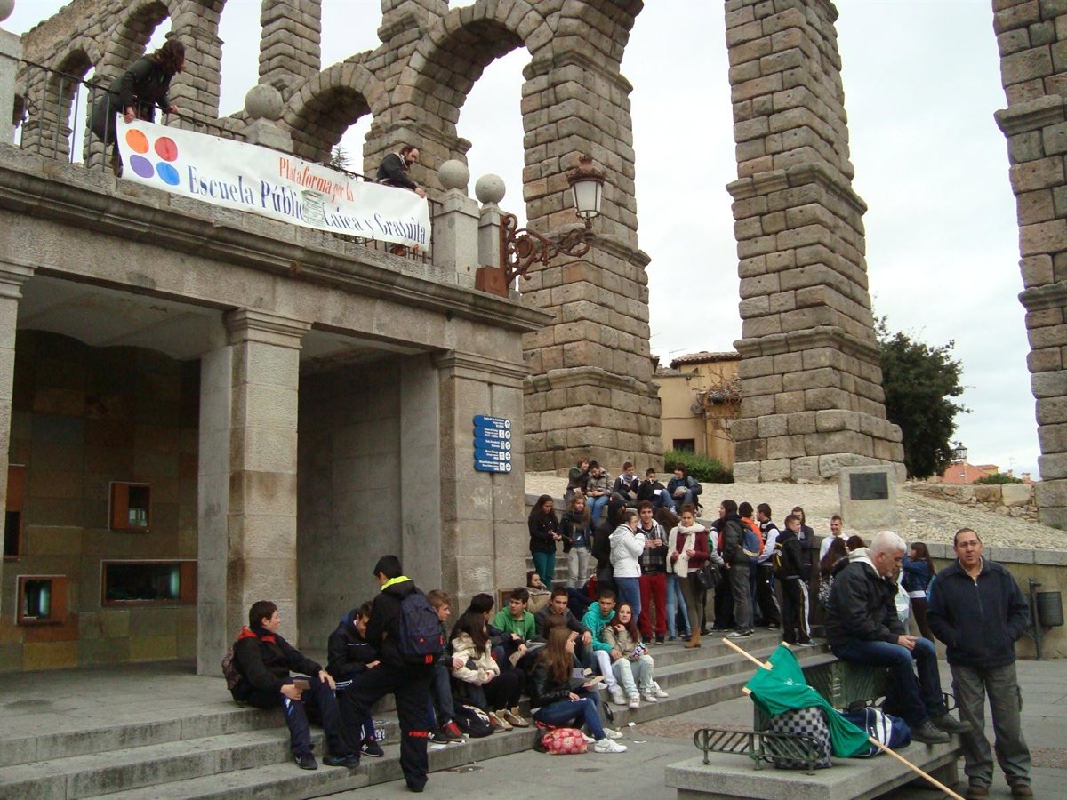 Alrededor de un centenar de personas, la mayoría alumnos de instituto y profesores, se ha concentrado este jueves a los pies del Acueducto de Segovia para mostrar su rechazo a las políticas "incendiarias" del ministro de Educación, José Ignacio Wert, y ha llamado a la sociedad a unirse contra las agresiones "sistemáticas" al modelo de enseñanza.