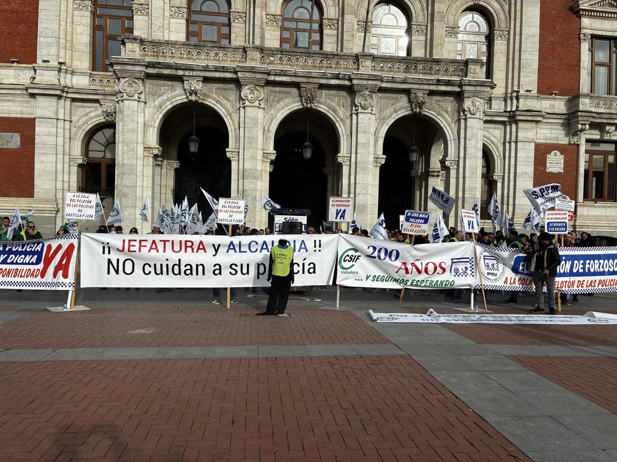Más de un centenar de policías municipales se han concentrado en la Plaza Mayor de Valladlid para exigir la eliminación definitiva de los servicios forzosos, la compensación real de la disponibilidad, y la implantación de medidas de planificación que permitan mejorar los descansos y la conciliación de la vida laboral y personal.