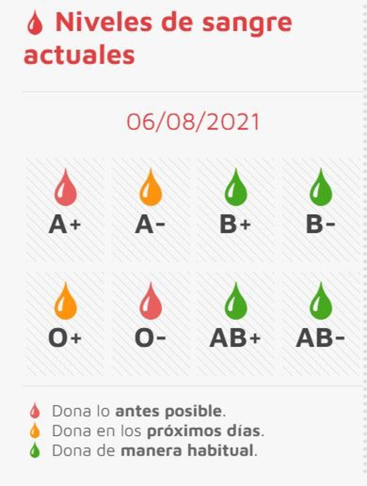 A través de su página web, refleja que esas reservas están en estos dos grupos en nivel rojo, por lo que llaman a donar "lo antes posible" a aquellos donantes con estos tipos sanguíneos.