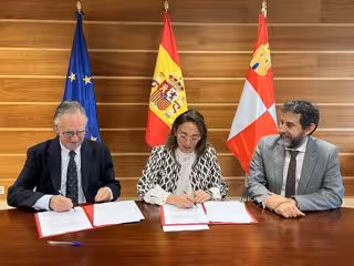 La presidenta del patronato de Scayle y consejera de Movilidad y Transformación Digital, María González Corral, y su homólogo en el Ctic, Roberto Paraja, durante la firma del convenio entre ambas entidades - JCYL