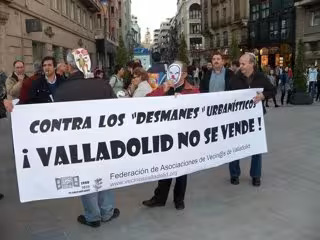 Los manifestantes portaban una pancarta en la que se podía leer 'Contra los desmanes urbanísticos: Valladolid no se vende', a la vez que hacían sonar sus cacerolas y llevaban caretas con la efigie del regidor de la capital.