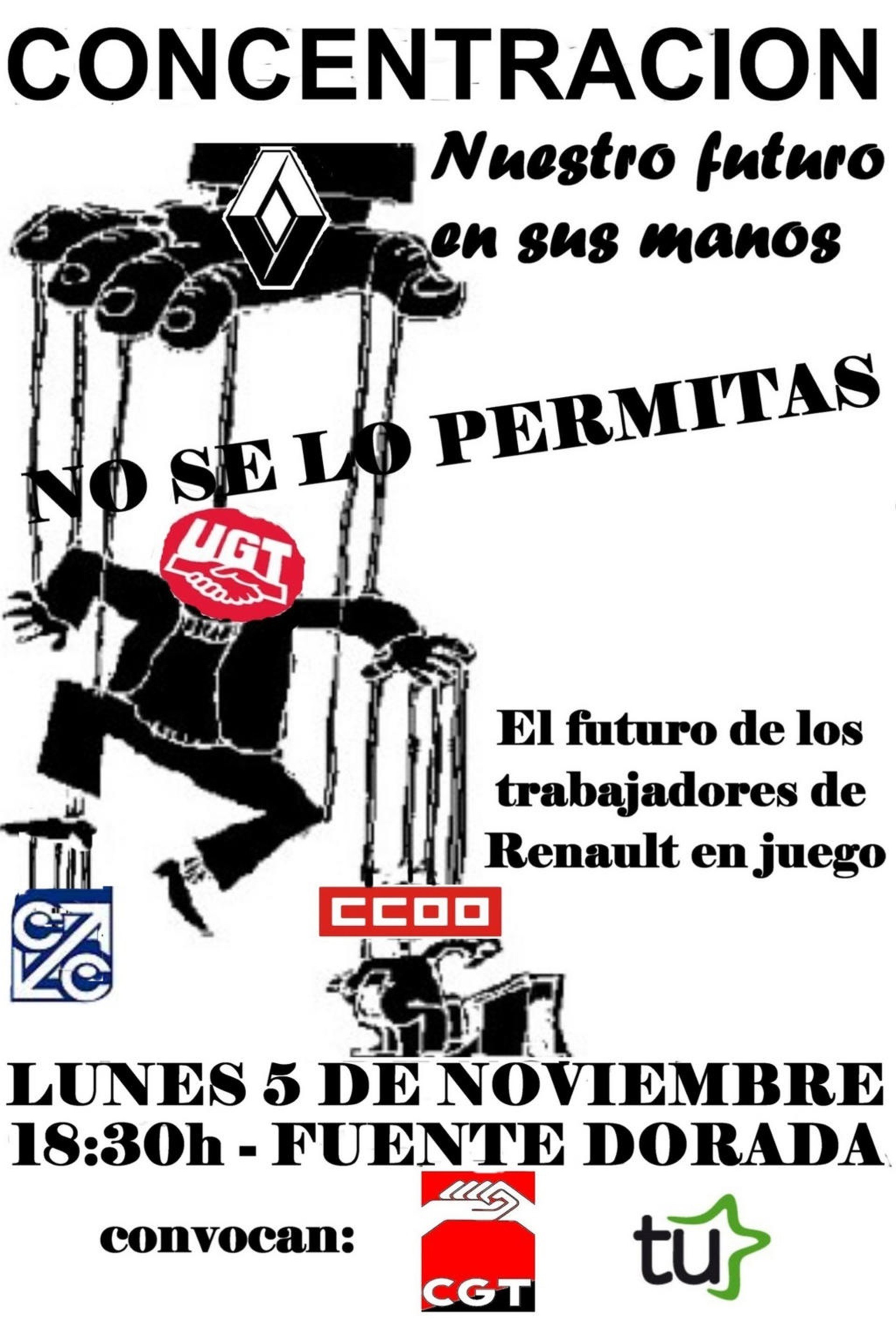 La concentración se celebrará a partir de las 18.30 horas en la plaza de la Fuente Dorada bajo el lema, 'Nuestro futuro en tus manos. No se lo permitas. El futuro de los trabajadores de Renault en juego'.
