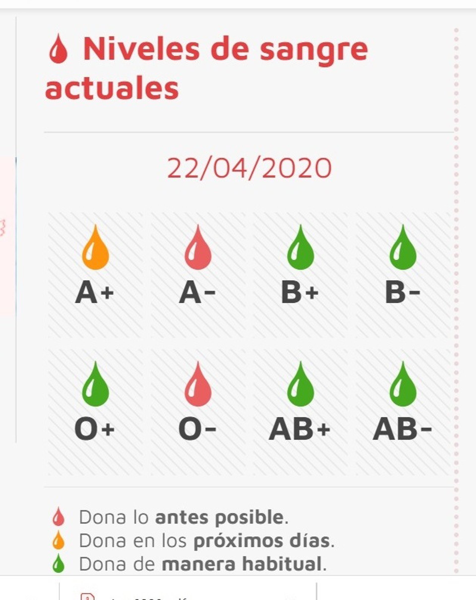 En el caso del resto de los tipos (B+, B-, 0+, AB+ y AB-) se encuentran en verde, lo que se traduce en una petición de acudir a donar de manera normal.
