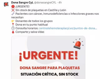 A través de la red social X, el Chemcyl hace un llamamiento urgente ante la "situación crítica" por la falta de plaquetas, lo que afecta a enfermos de cáncer, personas con enfermedades del sistema inmune, con infecciones severas, tratamientos de quimioterapia o insuficiencia renal.