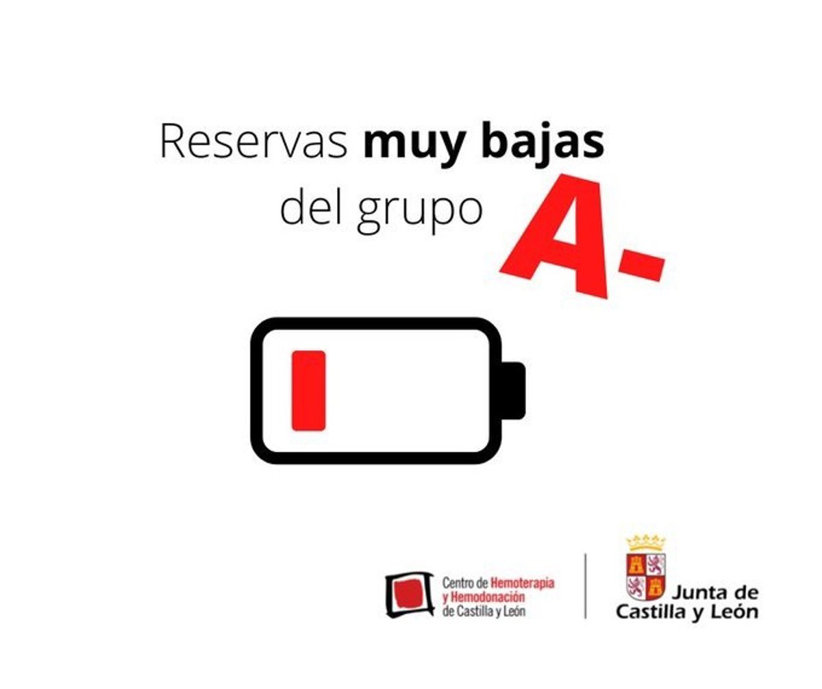 Mensaje de @donasangreCYL sobre el estado de las reservas de sangre del tipo A- - @DONASANGRECYL