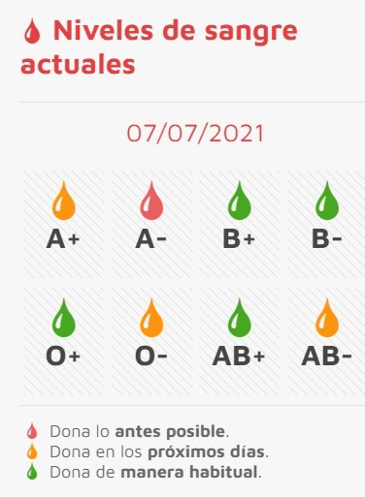 Las reservas del resto de los tipos sanguíneos, B+, B-, O+ y AB+, están en verde por lo que se llama a donar de forma habitual.