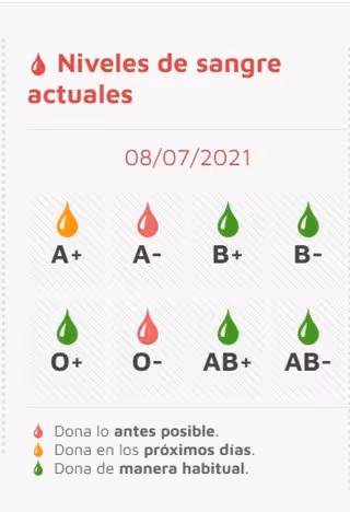 Además, según la información del Centro, se encuentra en nivel naranja la reserva del grupo sanguíneo A+, por lo que también se necesitan donaciones "en los próximos días".