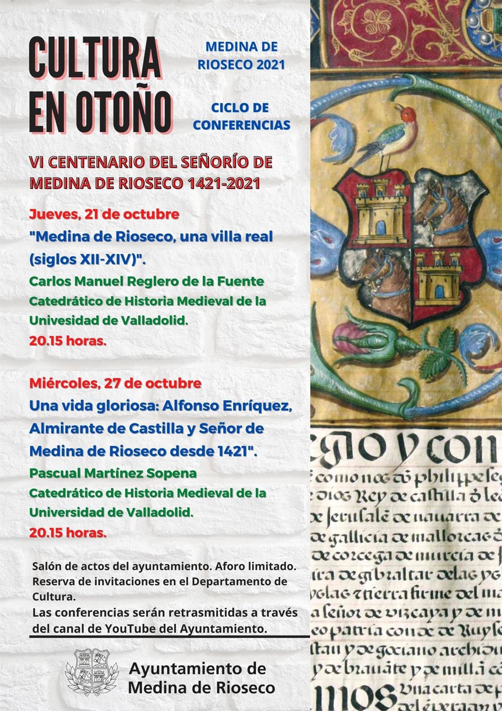 El Ayuntamiento de Medina de Rioseco (Valladolid), bajo el título genérico de 'Cultura en Otoño', ha organizado para los meses de octubre a diciembre un ciclo de conferencias de carácter divulgativo con el fin de generar espacios de diálogo e intercambio, dinamizar la vida cultural de la ciudad y poner en valor su patrimonio, historia, etnografía, pensamiento o literatura, entre otros temas.