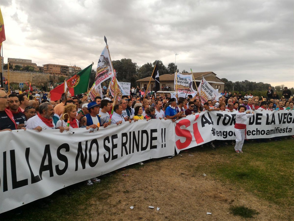Cientos de personas se han manifestado a favor del Toro de la Vega tras una pancarta en la que se podía leer "Tordesillas no se rinde", con banderas, carteles y pegatinas en reivindicación de este torneo en el que el astado era alanceado y cuya muerte ha prohibido la Junta de Castilla y León mediante un decreto ahora recurrido ante el Tribunal Constitucional.