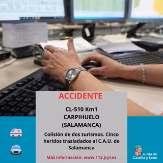Cinco personas, entre ellas dos menores de 11 y 17 años, han resultado heridas como consecuencia de un accidente de circulación registrado a primera hora de la tarde de este viernes en la CL-510 a la altura del término salmantino de Carpihuelo, según los datos que aporta el Servicio de Emergencias de Castilla y León 112.