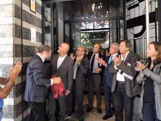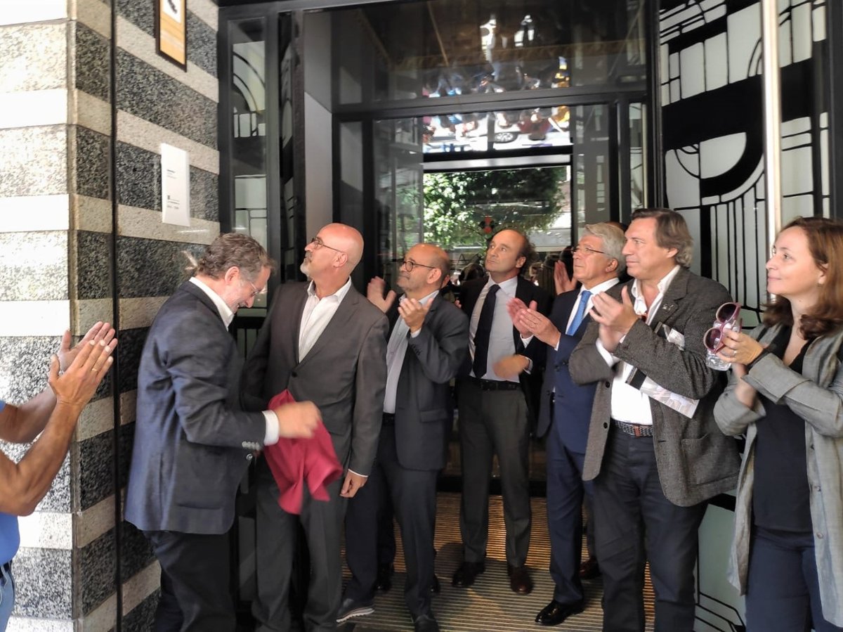 El concejal de Planeamiento Urbanístico y Vivienda del Ayuntamiento de Valladolid, Manuel Saravia, ha descubierto la placa DOCOMOMO ante los asistentes, entre los que se encontraban el presidente del Colegio de Arquitectos de Valladolid, Manuel Vecino; el productor de cine y presidente del Atlético de Madrid, Enrique Cerezo, propietario del edificio; el director de la Etsava, Darío Álvarez; el arquitecto encargado de la última reforma, José Ignacio Izquierdo; el representante de Docomomo en el COAVA, Daniel Villalobos; la representante de esta organización, Nieves Fernández, y el representante del estudio Bentabol + Rodrigo, Eduardo Rodrigo.