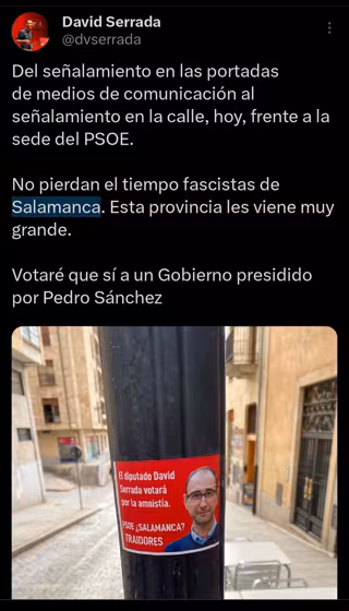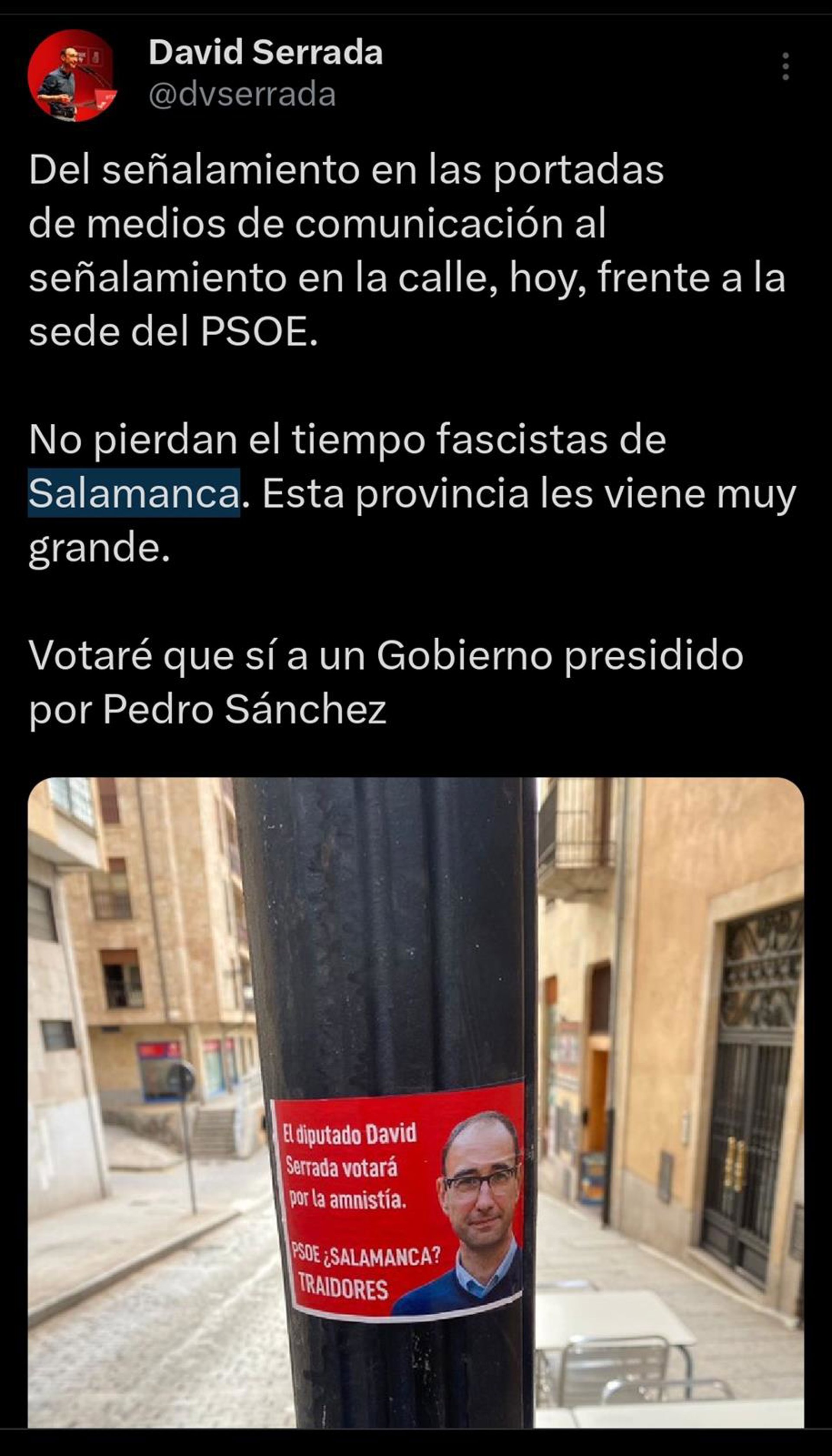 A través de su perfil en la red social 'X', Serrada ha apuntado: "Del señalamiento en las portadas de medios de comunicación al señalamiento en la calle, hoy frente a la sede del PSOE. No pierdan el tiempo fascistas de Salamanca. Esta provincia les viene muy grande. Votaré que sí a un Gobierno presidido por Pedro Sánchez"".