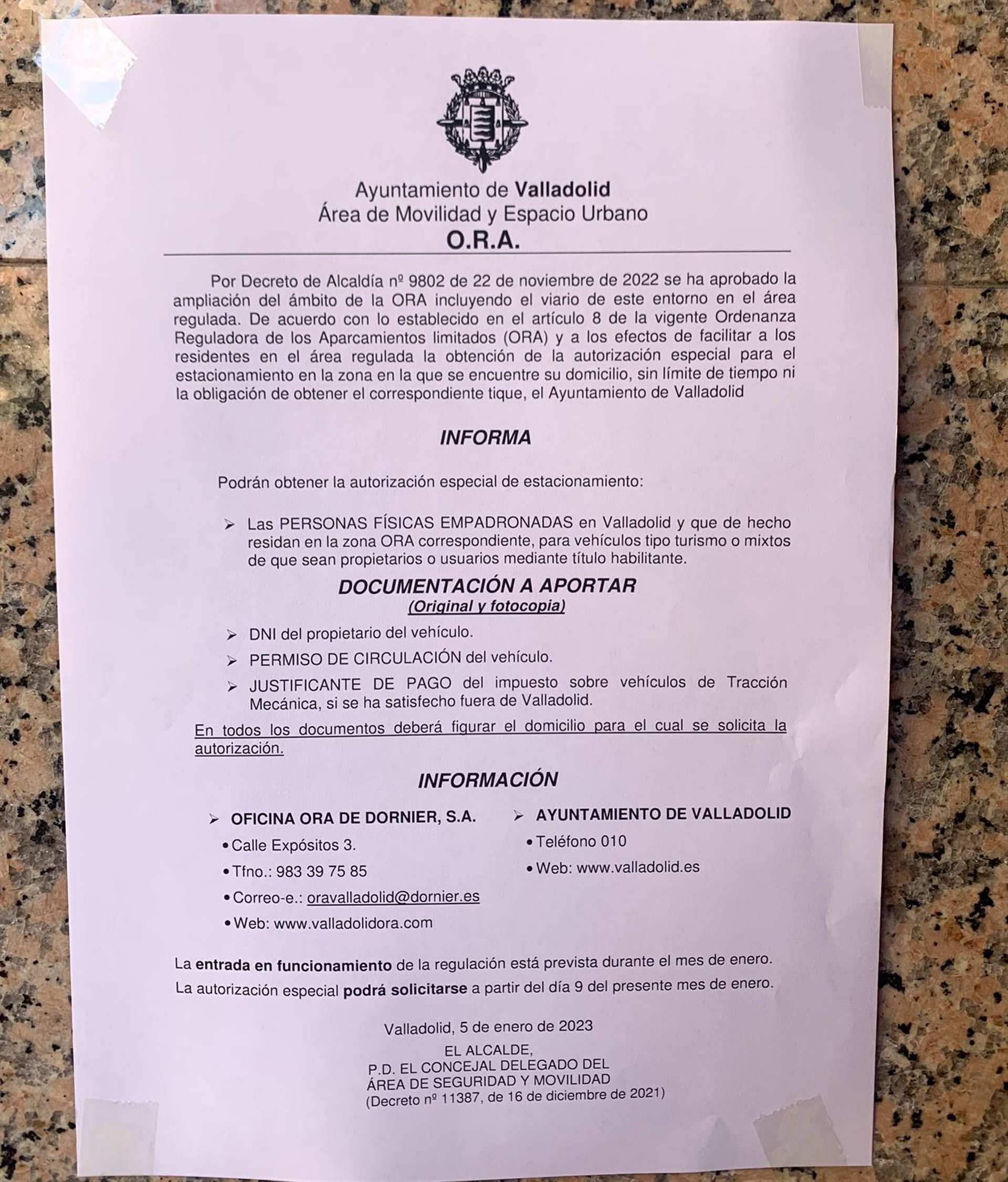 En los portales de edificios de estos barrios ya se han colocado circulares informativas que dan traslado de dicho acuerdo e informan de las posibilidades para que las personas empadronadas en Valladolid que residan en estas nuevas áreas de la ORA soliciten la tarjeta de autorización especial para estacionamiento en la zona de su domicilio.