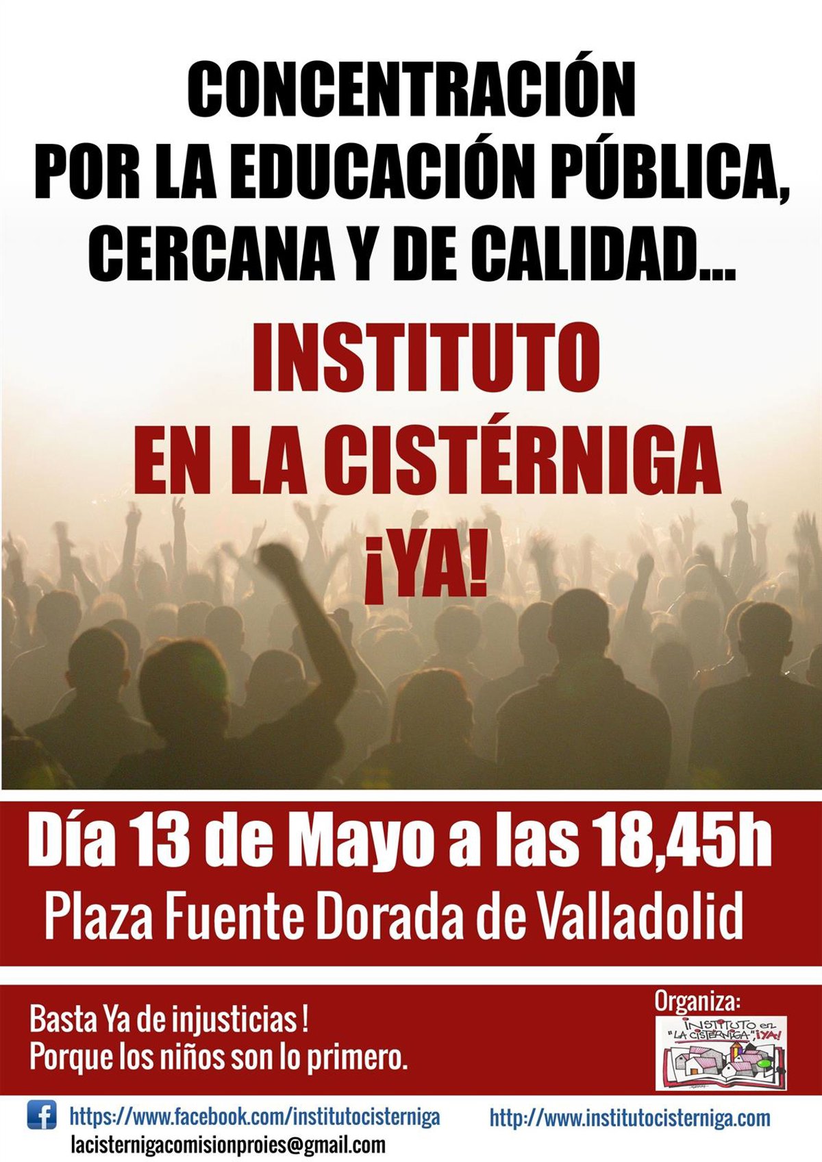La Comisión Pro-Instituto de La Cistérniga ha convocado para mañana, fiesta local con motivo de la festividad de San Pedro Regalado, la celebración de una concentración reivindicativa en la Plaza de Fuente Dorada de Valladolid.