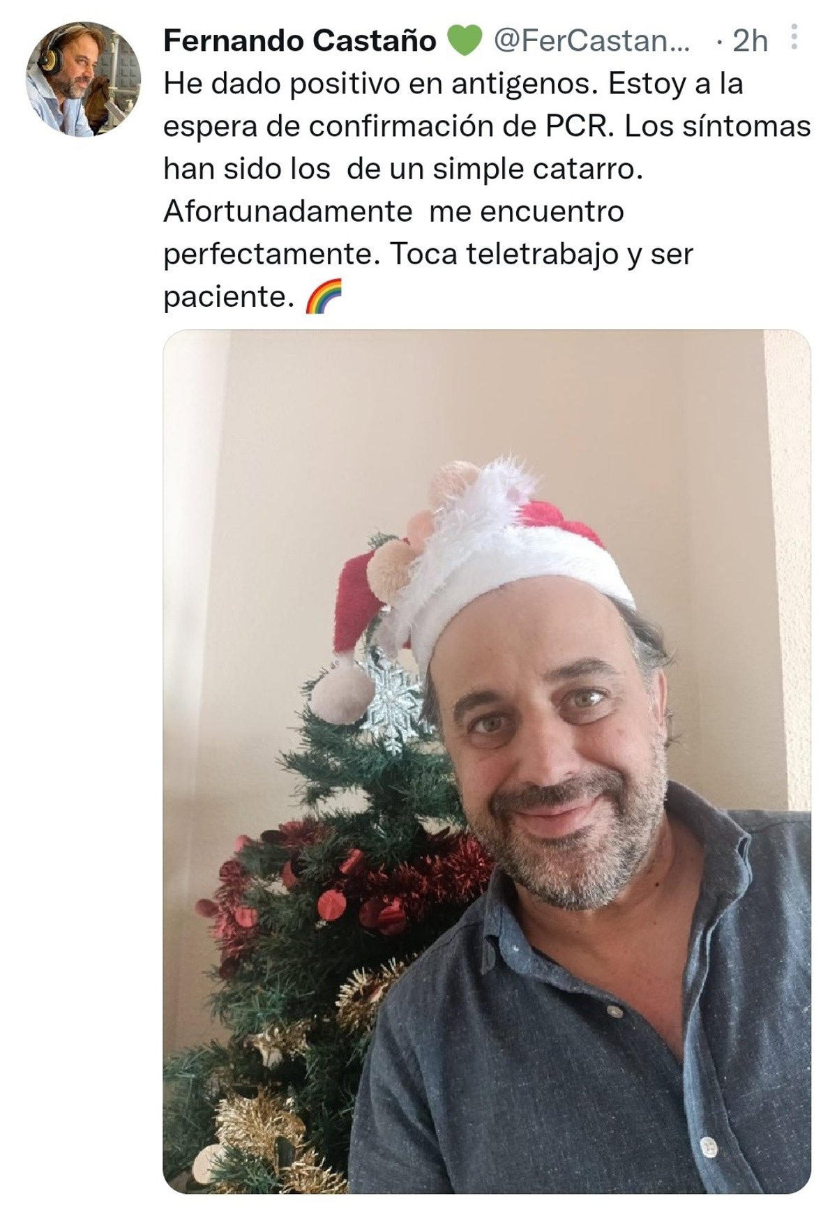 En el mensaje, publicado en Twitter y recogido por Europa Press, ha manifestado: "He dado positivo en antígenos. Estoy a la espera de confirmación de PCR. Los síntomas han sido los de un simple catarro. Afortunadamente me encuentro perfectamente. Toca teletrabajo y ser paciente".