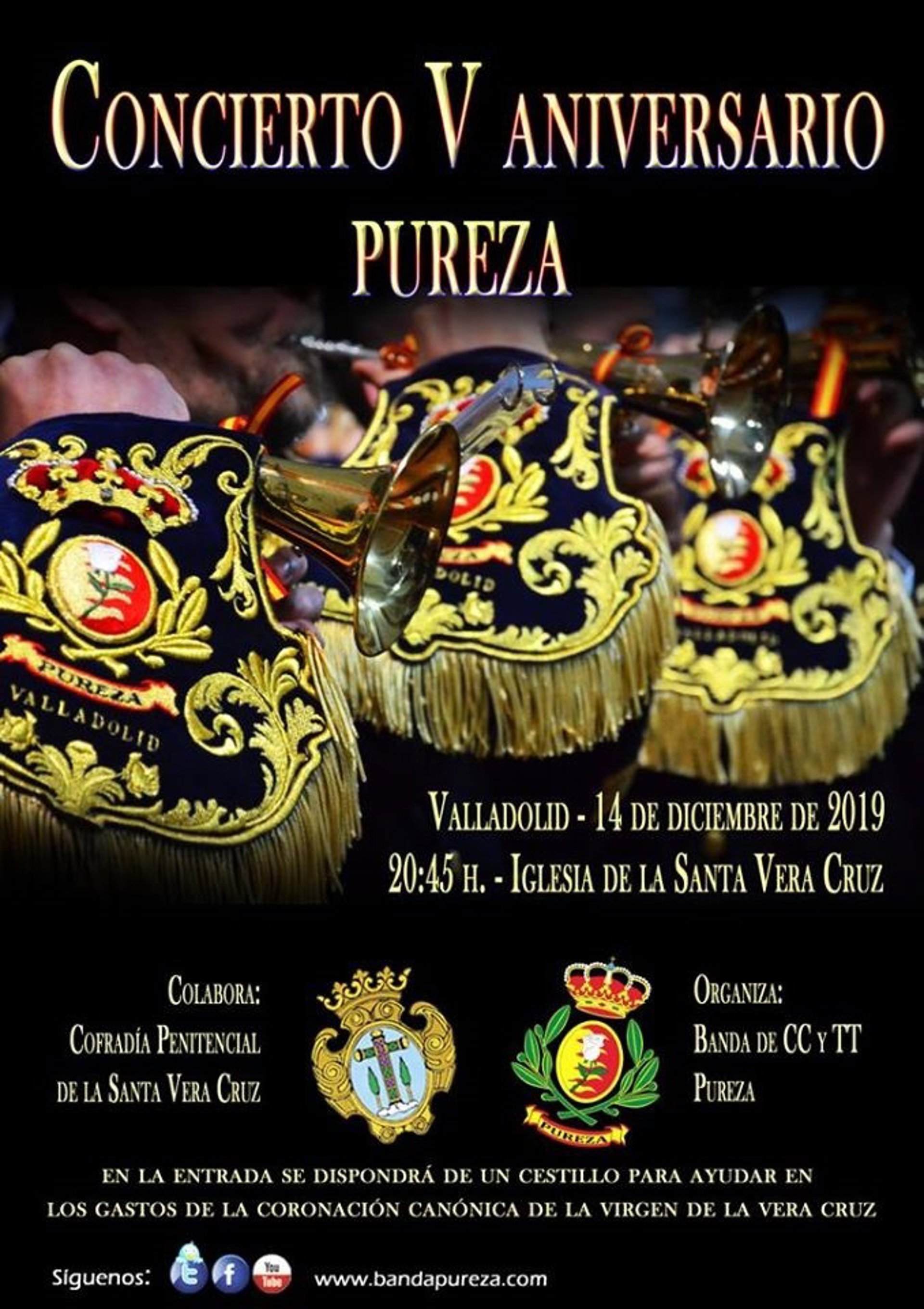 Cartel anunciador del concierto de este sábado a cargo de la Banda de CCTT 'Pureza' con movito del V aniversario de su creación. - COFRADÍA DE LA VERA CRUZ DE VALLADOLID.