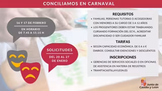 Este martes, 20 de enero, se ha abierto el plazo para solicitar participar en el programa Conciliamos 2026 en Carnaval, servicio de conciliación que se prestará durante los días 16 y 17 de febrero (lunes y martes), con excepción de los municipios de la provincia de Soria en los que se celebre en otras fechas, que serán previamente comunicadas a la Gerencia de Servicios Sociales por sus respectivos ayuntamientos.