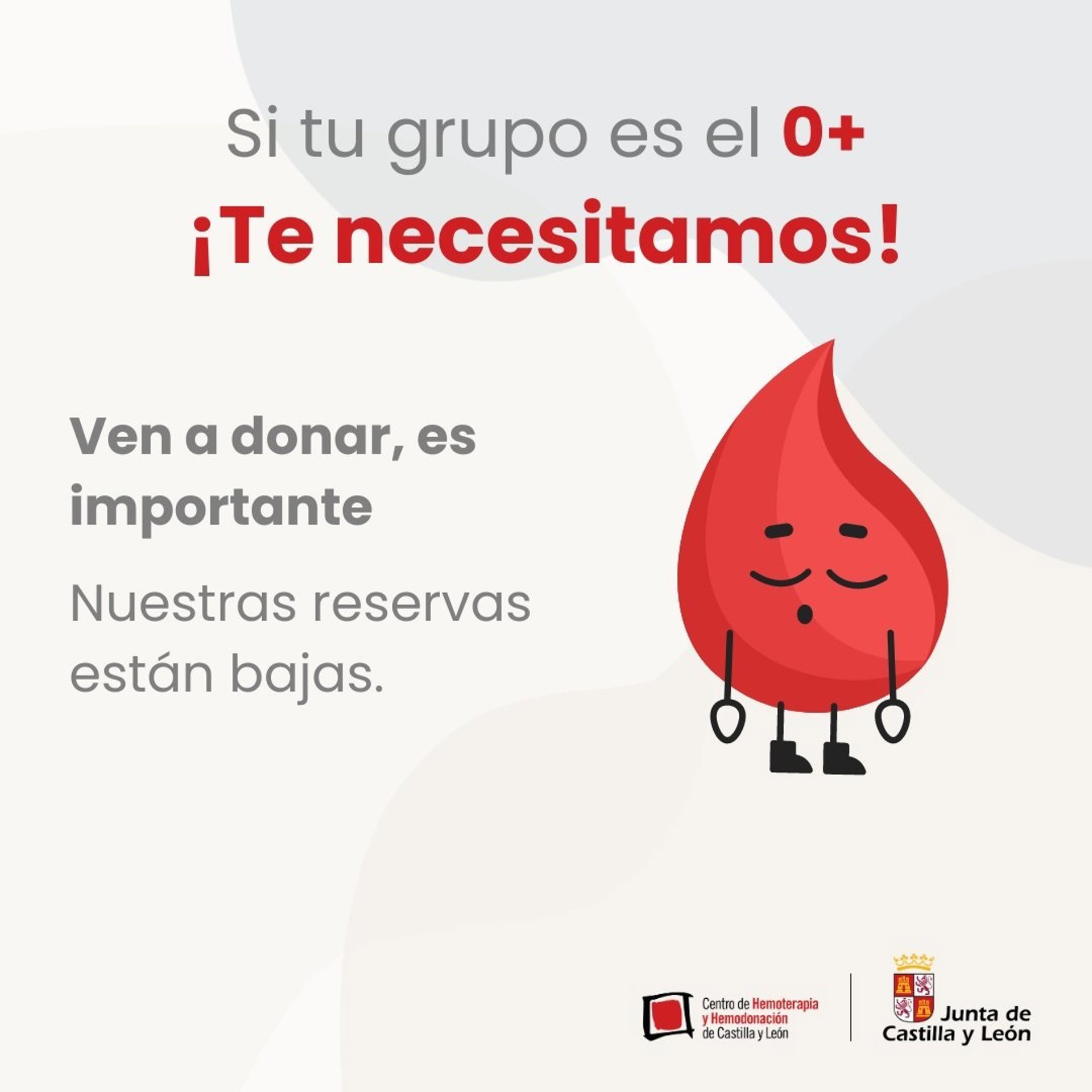 La comunidad autónoma de Castilla y León termina la semana con déficit en las reservas de sangre del grupo 0+ por lo que el Centro de Hemoterapia y Hemodonación ha vuelto a hacer un llamamiento a los ciudadanos para que acudan a donar de forma urgente .