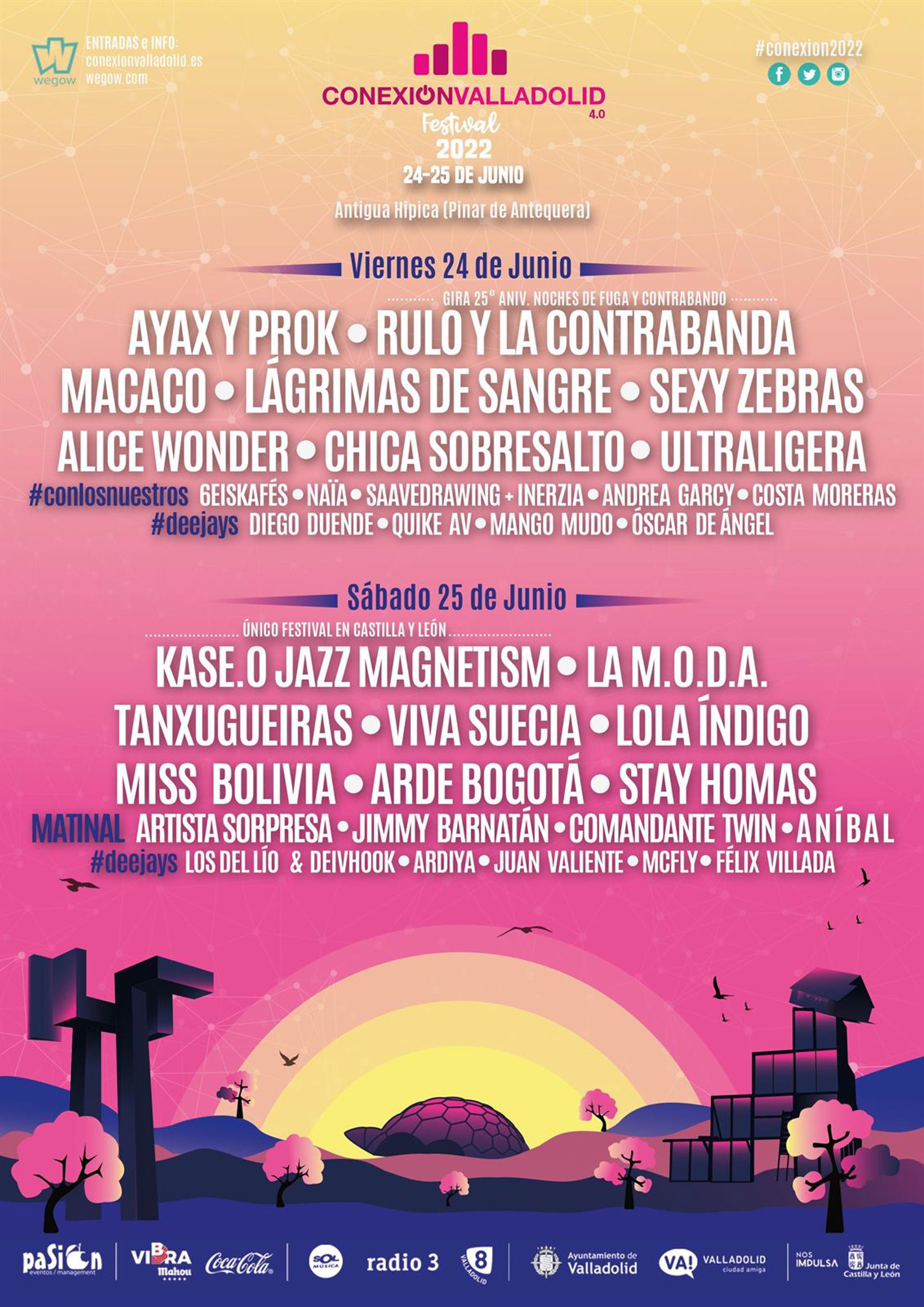 El sábado 24 de junio, por su parte, será el turno de Kase O; Magnetism, un "referente nacional" del rap; el grupo burgalés La M.O.D.A., que es un "imprescindible" del Conexión; las gallegas Tanxugeiras, artistas "revelación" del año; Viva Suecia; Lola Índigo y Miss Bolivia.