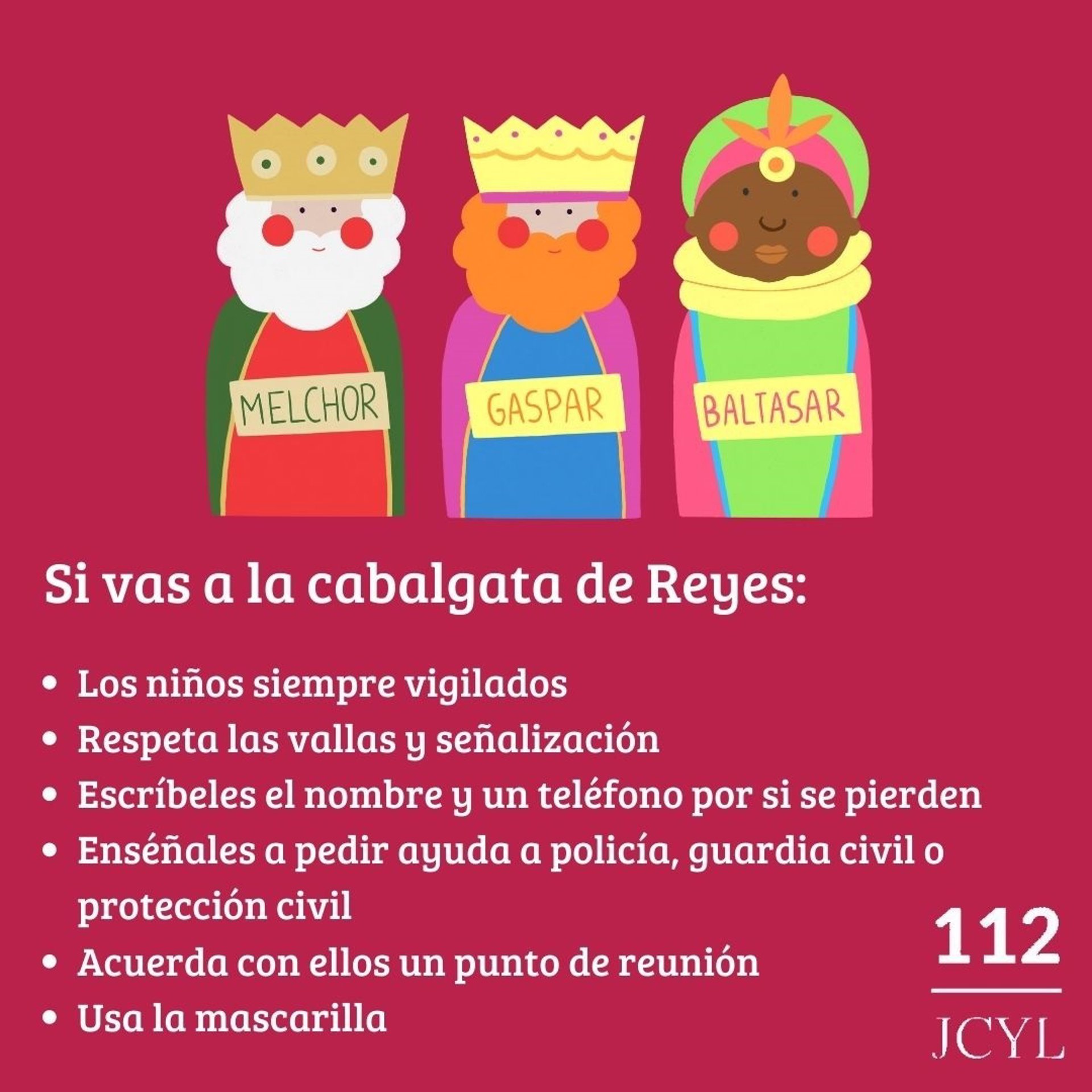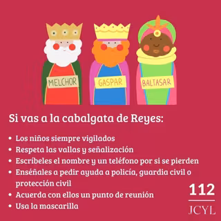 El Servicio de Emergencias de Castilla y León 112 ha difundido varios consejos a los castellanos y leonesa con el objetivo de poder vivir unas cabalgatas seguras entre los que destaca la importancia de vigilar a los niños y la insistencia en el uso de las mascarillas en todo momento.