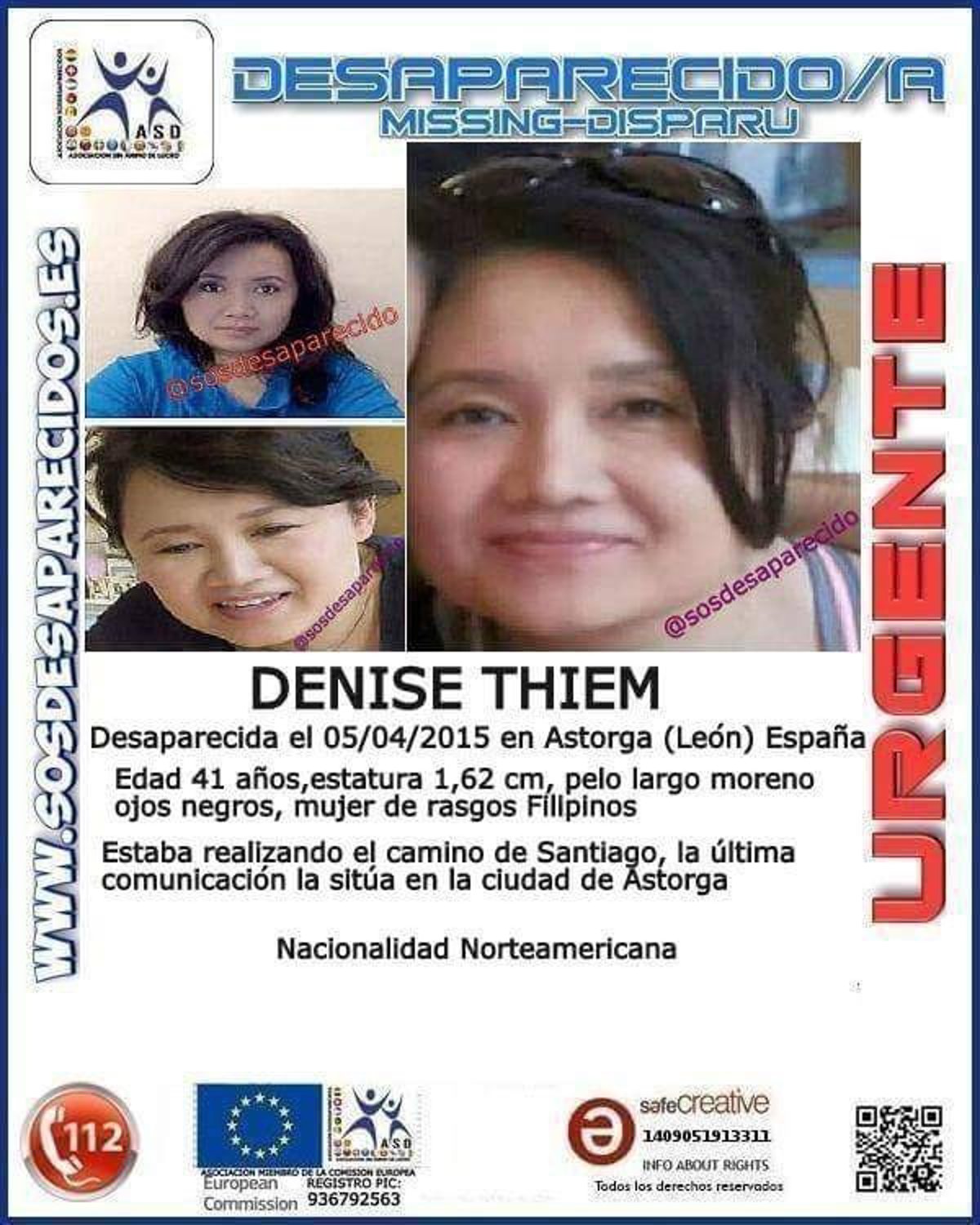 La Policía Nacional y la Guardia Civil están buscando a una peregrina estadounidense, Denise Thiem, de 41 años y origen chino, que estaba realizando el Camino de Santiago y que ha desaparecido en el entorno del municipio leonés de Astorga.