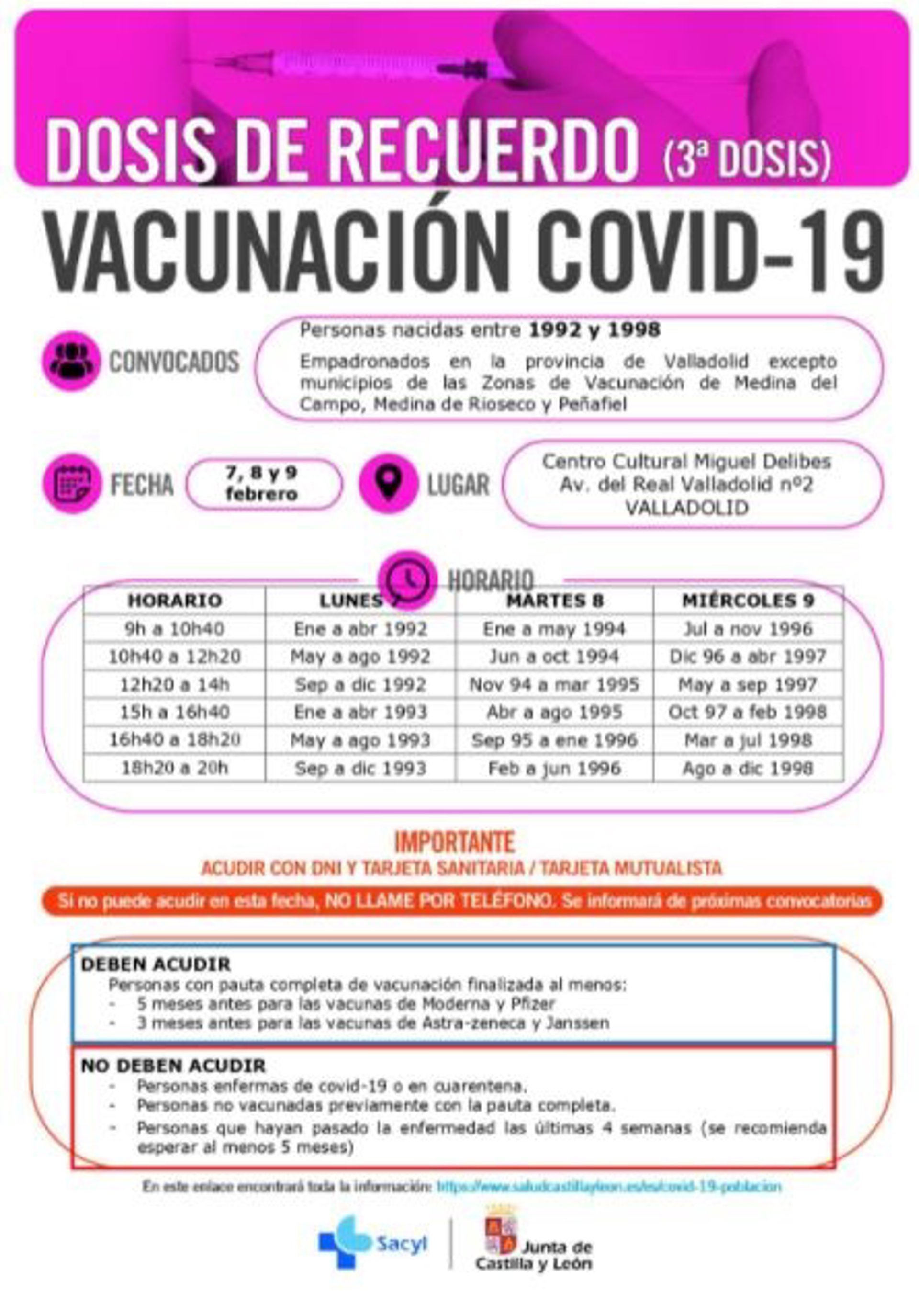 La Junta de Castilla y León ha convocado a un nuevo llamamiento para la dosis de recuerdo de la vacuna contra el SARS-CoV-2 en el punto de vacunación del Centro Miguel Delibes de Valladolid capital los días 7, 8 y 9 de febrero a los jóvenes nacidos entre 1992 y 1998.