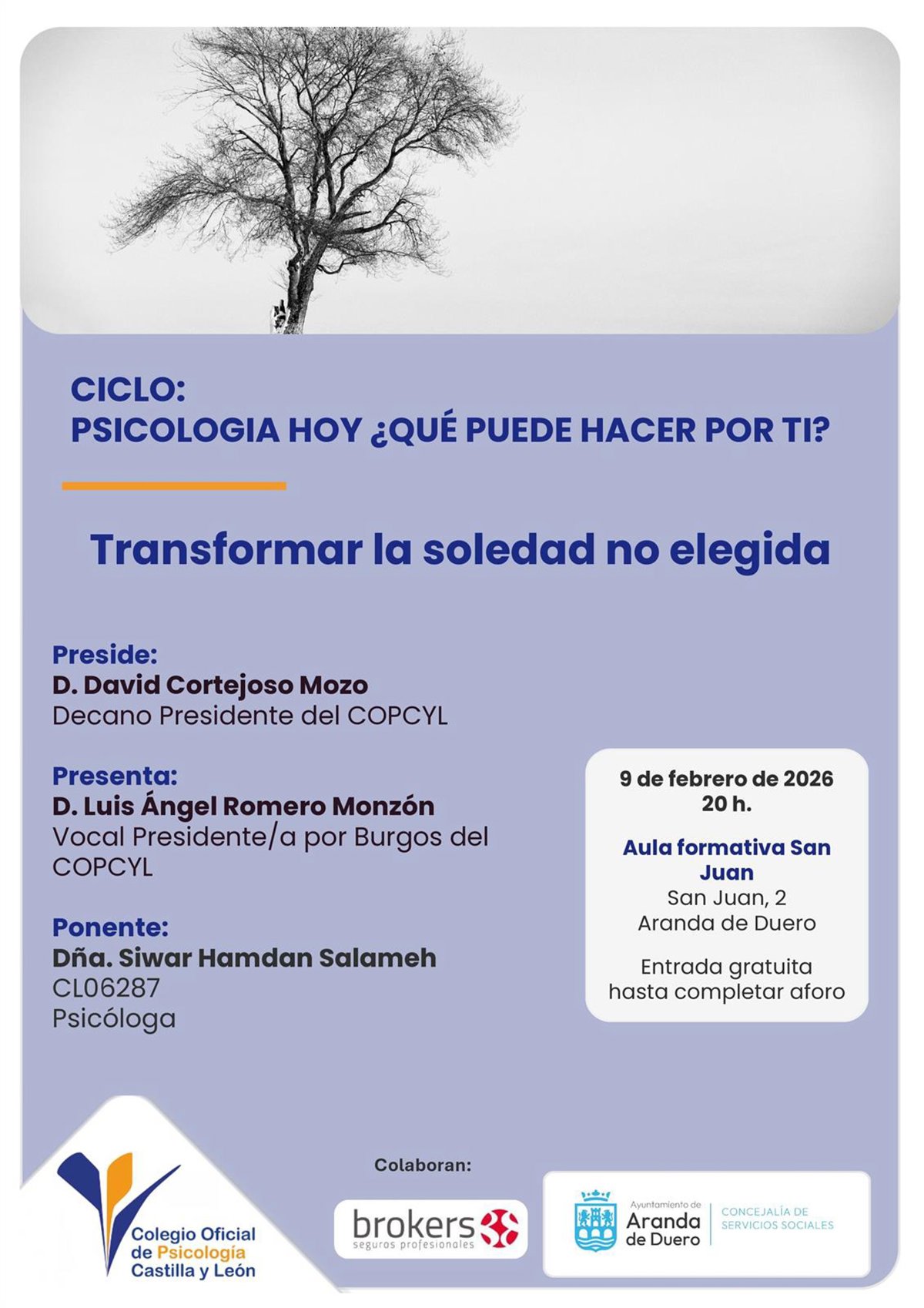 El Colegio de Psicología de Castilla y León (Copcyl) celebrará el próximo lunes 9 de febrero en Aranda de Duero (Burgos) la charla 'Transformar la soledad no elegida' dentro del ciclo 'Psicología Hoy: ¿qué puede hacer por ti?'.