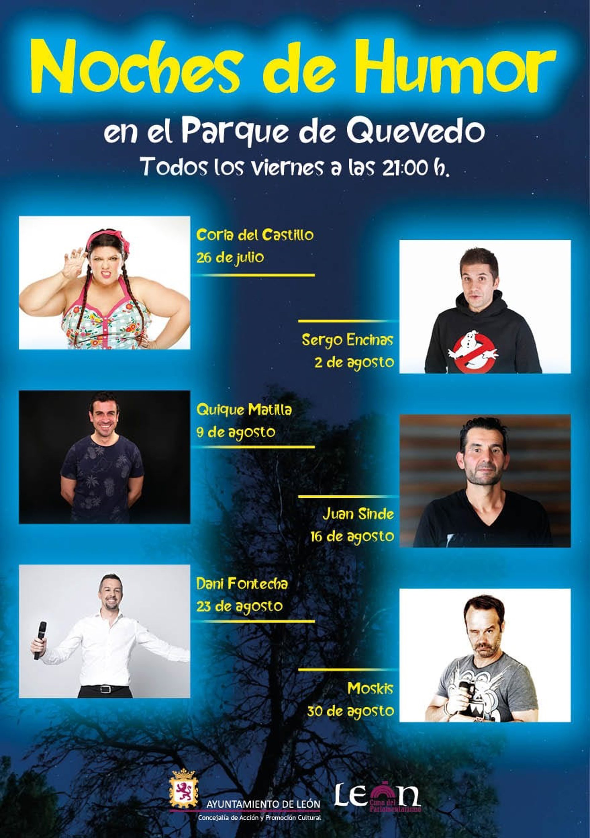 Coria Castillo, Sergio Encinas, Quique Matilla, Juan Sinde, Dani Fontecha y Moskis serán los encargados de llenar de risas las veladas de las 'Noches de humor' que regresan a la programación estival del Ayuntamiento de León, una iniciativa de la Concejalía de Acción y Promoción Cultural que en esta edición se desarrollará en el parque de Quevedo.