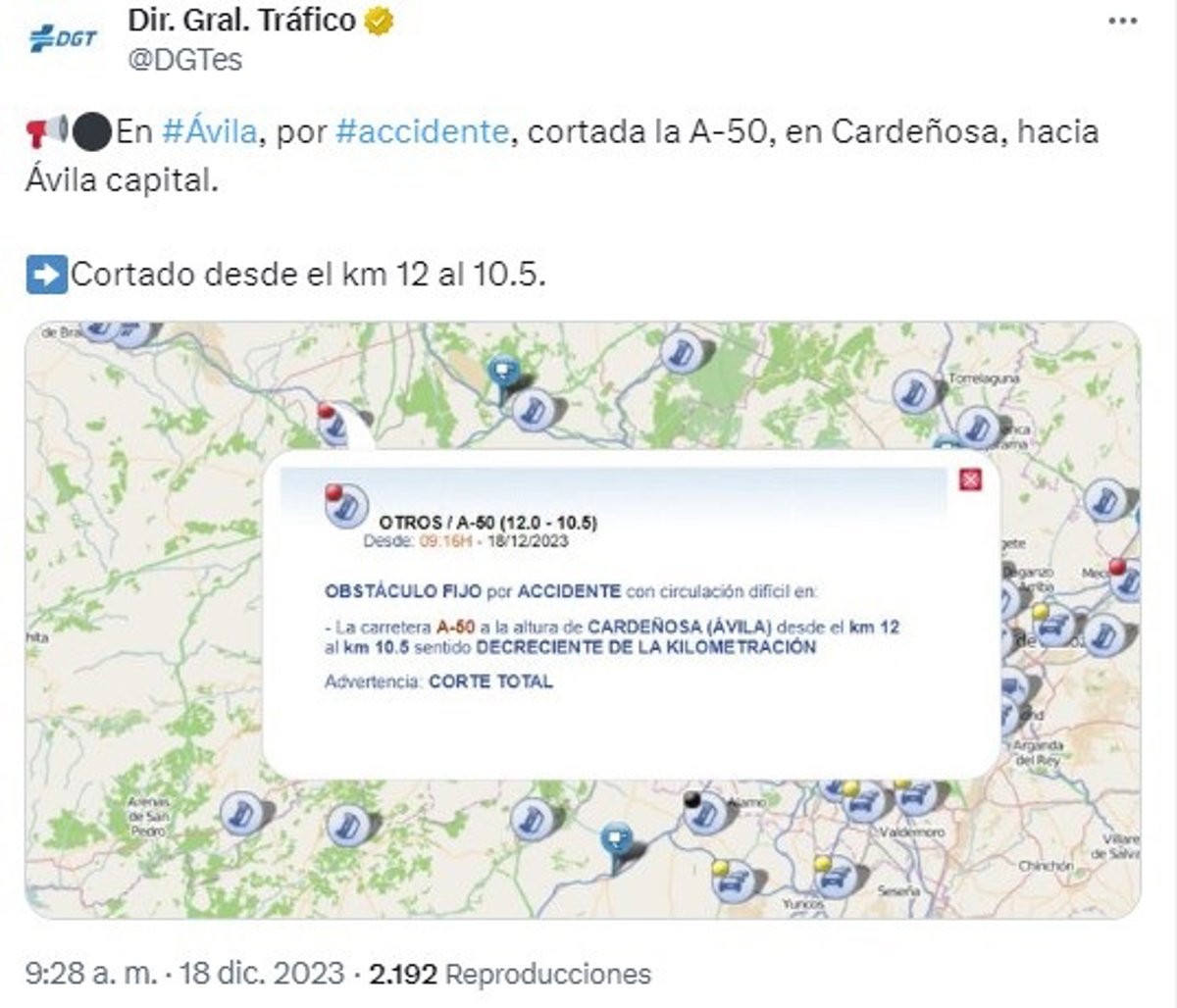 Un accidente múltiple en el que se han visto implicados al menos siete vehículos mantiene la A-50 cortada a la altura del kilómetro 10,500 sentido Ávila, dentro del término municipal de Cardeñosa.