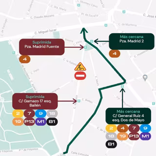 Esto va a llevar consigo que se van a suprimir dos paradas, la de la calle Gamazo 17, esquina Bailén, y la plaza Madrid también se verá suprimida y se van a habilitar dos paradas provisionales, una en la calle Gamazo 17, la otra en la calle Gamazo 17, esquina Bailén.