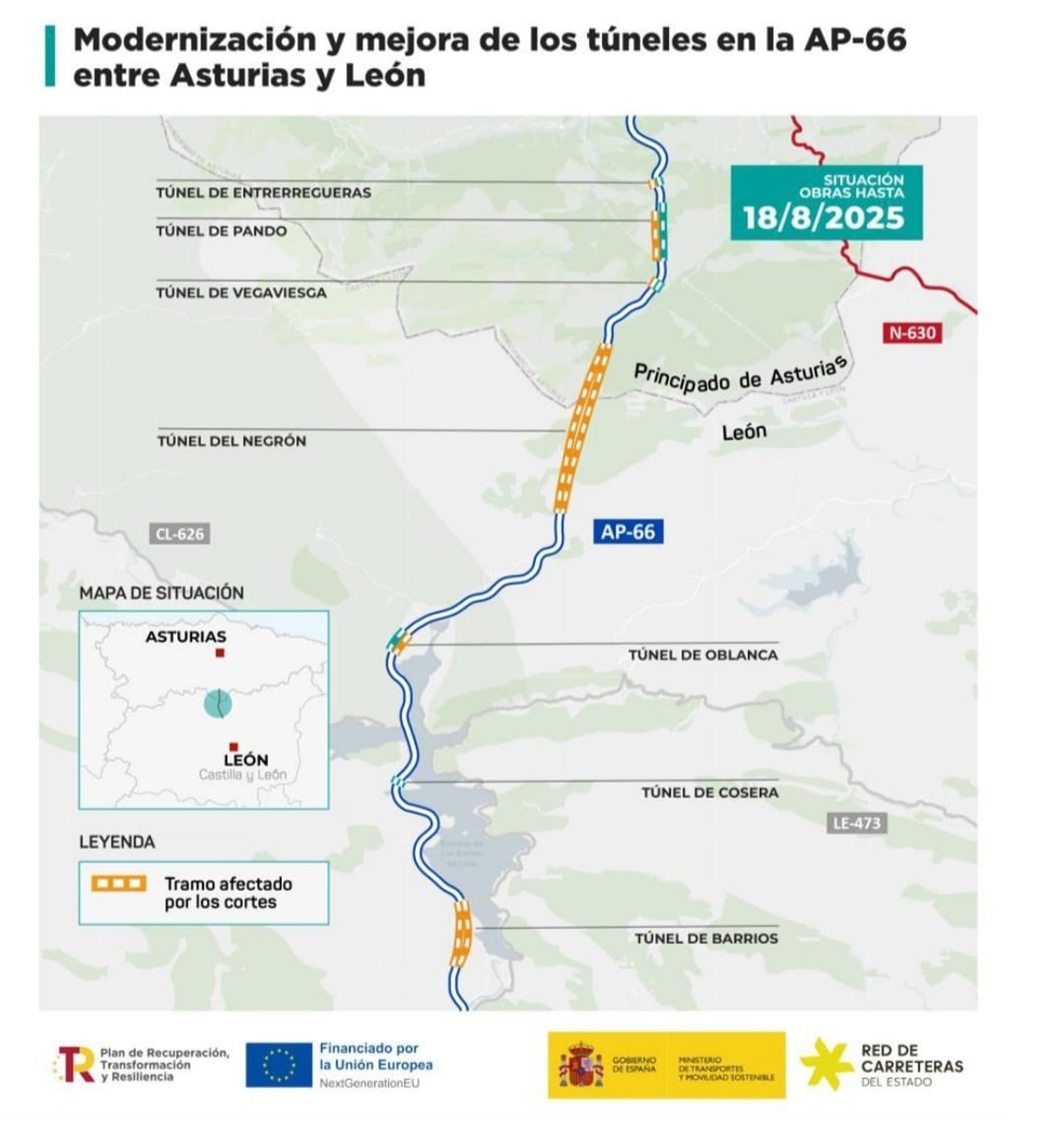 El Ministerio de Transportes y Movilidad Sostenible ejecuta las obras de modernización de los túneles de Entrerregueras, Pando, Vegaviesga, Negrón, Oblanca, Cosera y Barrios, situados en la autopista AP-66 (León-Campomanes), entre Asturias y León, que cuentan con un presupuesto global de 68,14 millones de euros y supondrán desde el próximo día 7 cortes de tráfico.