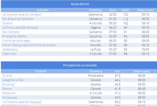Le siguen en rachas de viento San Roque de Riomiera, en Cantabria, con 112 kilómetros por hora, y Fisterra, en A Coruña, con 102, y en cuarto lugar está la estación meteorológica de La Pinilla, en Segovia, con 94.
