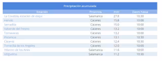 La estación de La Covatilla, ubicada en la provincia de Salamanca, encabeza el ranking de precipitación acumulada registrada en la mañana de este domingo con 27,8 litro por metro cuadrado, según información de la Agencia Estatal de Meteorología (Aemet) recogida por Europa Press.
