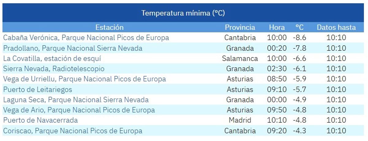 Completan la lista Vega de Ario Parque Nacional Picos de Europa (Asturias) y Puerto de Navacerrada (Madrid), ambas con -4,8, y Coriscao Parque Nacional Picos de Europa (Cantabria), con -4,3 grados.