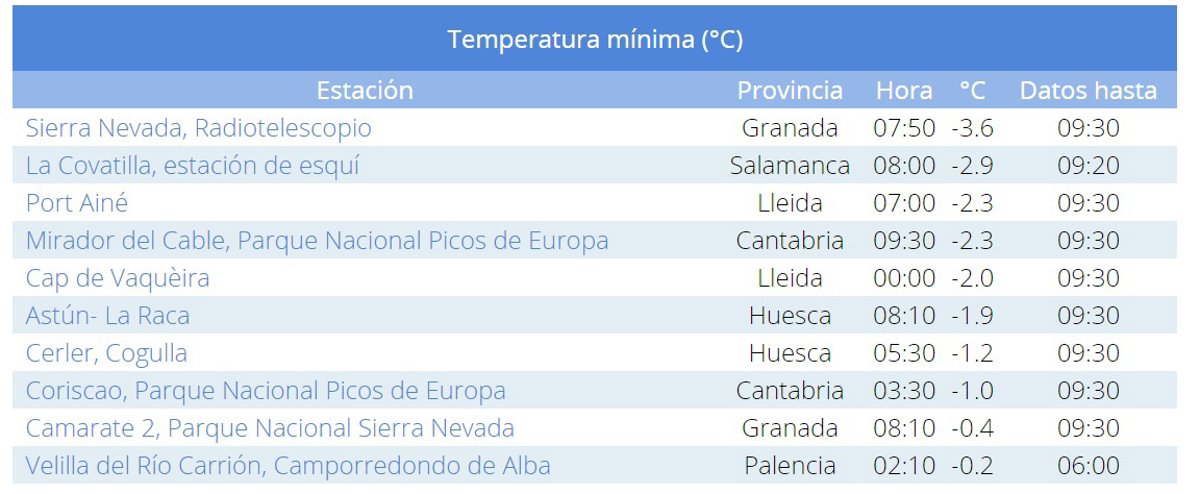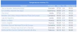 Por delante de ella se encuentran en tercera posición Port Ainé (Lleida), con -2,3 grados, seguida de Mirador del Cable del Parque Nacional Picos de Europa (Cantabria), con -2,3 grados; Cap de Vaquira (Lleida), con -2 grados; Astún-La Raca (Huesca), con -1,9 grados; Cerler (Huesca), con -1,2 grados; Coriscao (Cantabria), con -1 grados, y Camarate 2 Parque Nacional Sierra Nevada (Granada), con 0,4 grados.