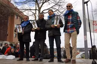 Seguidamente, el director de la Banda Municipal de Música, Miguel Ángel Cantera, ha recibido el Cristo de la Alegría de la mano del presidente de la Asociación de Vecinos del barrio del Cristo, Miguel Ángel Bruguera, por haber creado el Himno de Santo Toribio y destinar los beneficios que se saquen de su reproducción a la Asociación de Vecinos para ayudar a las personas más desfavorecidas del barrio.