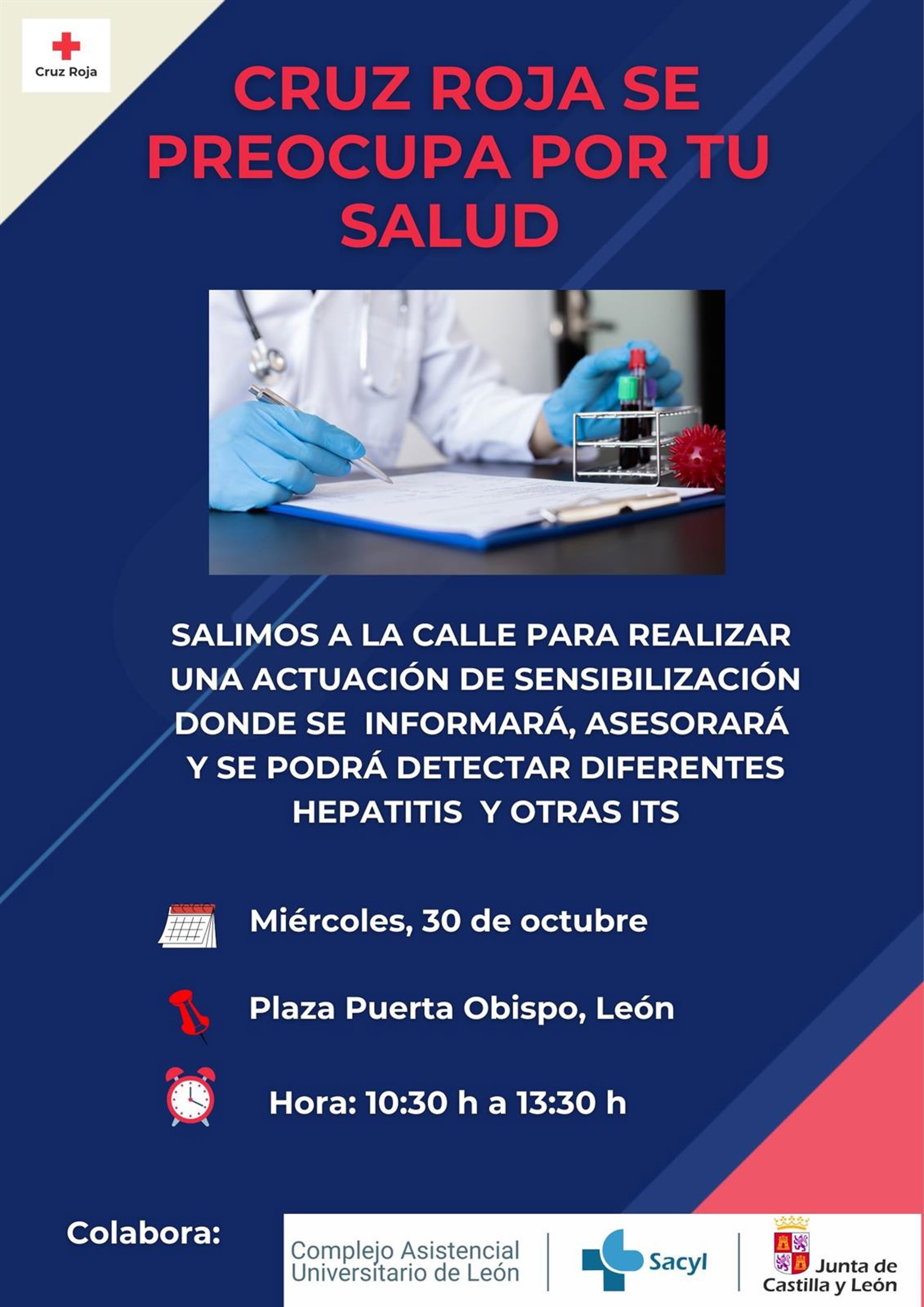La organización Cruz Roja llevará a cabo este miércoles, 30 de octubre, pruebas gratuitas de detección de Hepatitis y VIH en la plaza Puerta Obispo de León en el marco de su proyecto de Información y Prevención en materia de VIH, ITS, VHC y TBC.