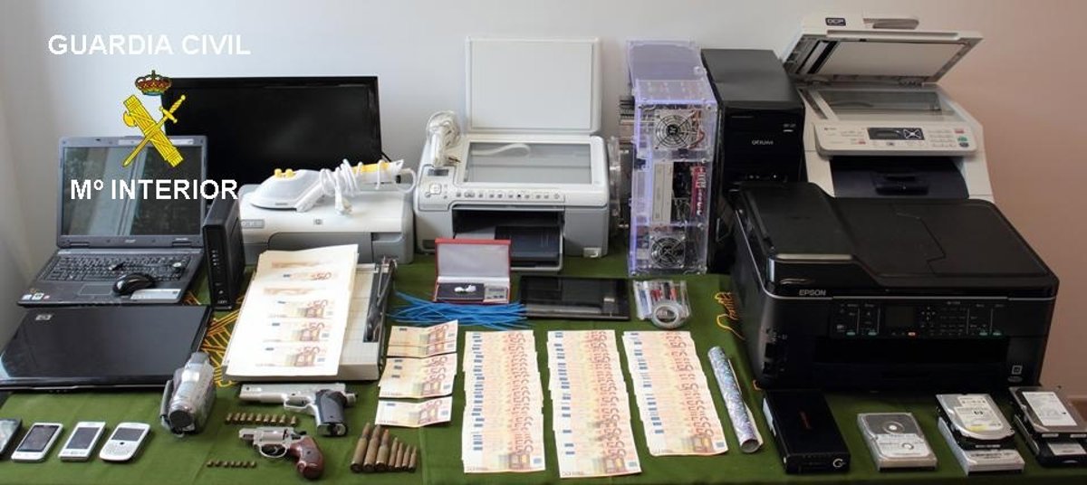 En esta primera fase se registraron dos domicilios en los que se aprehendieron 138 billetes de 50 euros (un total de 6.900 euros), falsificados o en proceso de completar su falsificación, así como numeroso material informático, dos armas de fogueo, munición y material para llevar a cabo una excelente falsificación de billetes de curso legal.