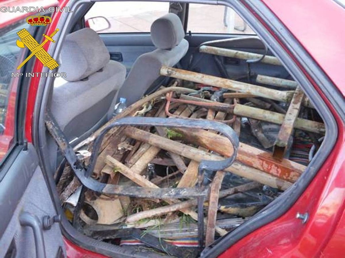 En la inspección realizada al vehículo propiedad de los detenidos, estacionado en las inmediaciones, los efectivos de la Guardia Civil encontraron en el interior del maletero las partes metálicas de la estructura de un banco de mobiliario urbano que, según la manifestación de los propios detenidos, son de la localidad de Valencia de Don Juan.