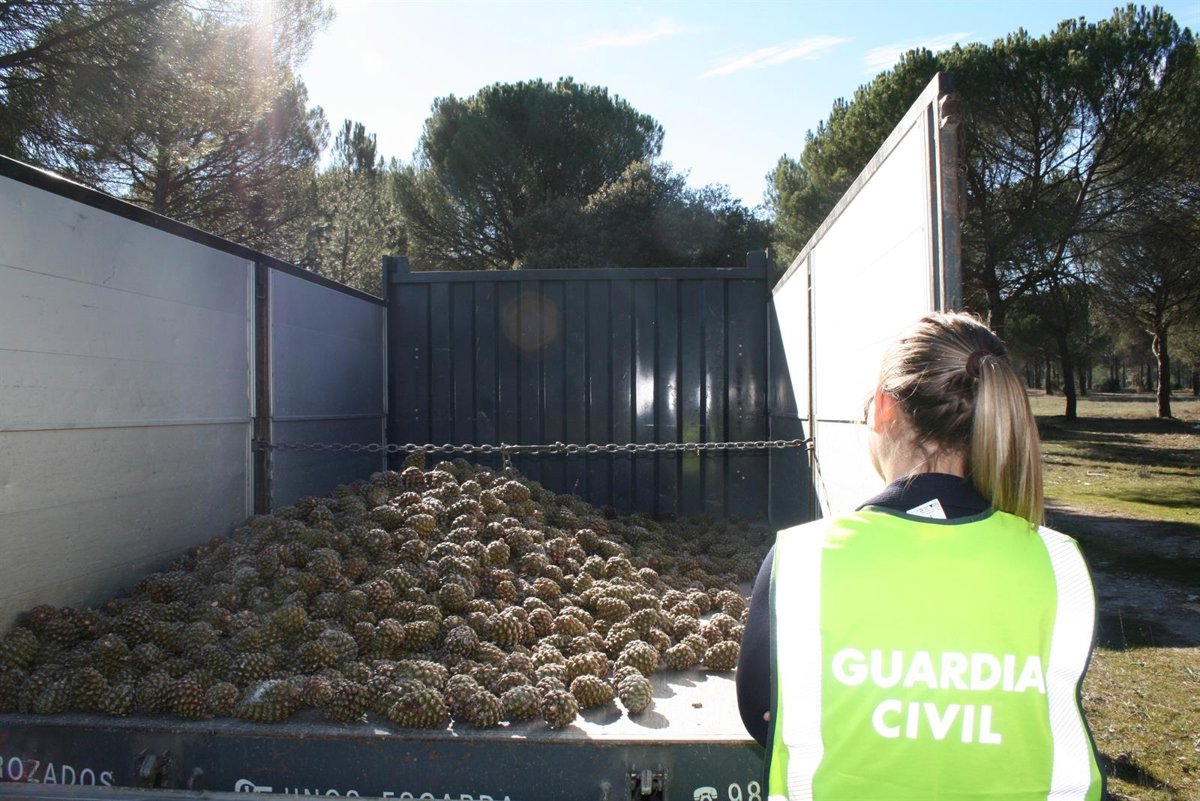 Agentes del Seprona de la Guardia Civil de Coca detuvieron a cuatro hombres a los que habían sorprendido cuando robaban piñas en la localidad segoviana de Gomezserracín.
