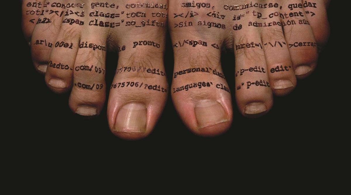 Los códigos fuente, las contraseñas, los códigos de barras, los circuitos o el DNI Electrónico sirven de elementos para sobreponer sobre los brazos, piernas o pecho de los modelos e incitar al visitante a reflexionar sobre las nuevas tecnologías y su presencia en la conducta humana.