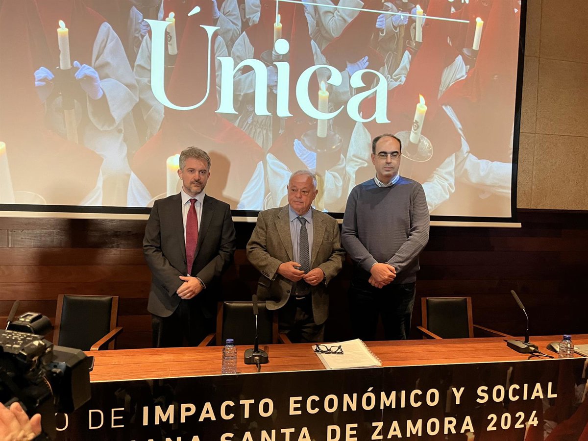 Santonja ha presentado el estudio sobre el impacto económico y social de la Semana Santa de Zamora junto al presidente de la Junta de Gobierno de la Junta Pro-Semana Santa Zamora, Israel López Campos, y Fernando Cabañeros, en representación de Excellence Innova, consultoría y Formación, la empresa que ha realizado el estudio.