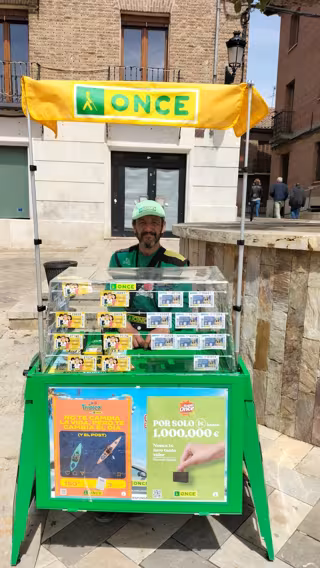 El vendedor de la ONCE Germán Alonso Cossio en su puesto de la ONCE en Saldaña (Palencia). - ONCE