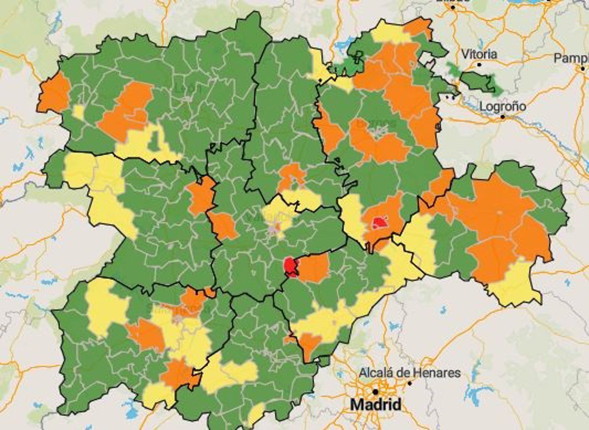 En Soria se mantienen seis zonas, si bien hay variación. Sale de esta situación San Esteban de Gormaz y entra Almazán. Además, también están al borde del confinamiento San Leonardo de Yagüe, Soria Rural, Gomara --presenta los niveles más preocupantes, 27,96 positivos por cada 10.000 habitantes--, Soria Sur y Norte.