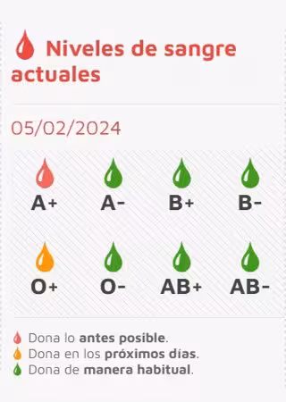 Y en el caso del grupo 0+ las reservas continúan en amarillo, lo que supone acudir a donar "en los próximos días", situación que se repite en las últimas semanas. Por su parte, las reservas del resto de tipos de sangre, A-, 0-, B+, B-, AB+ y AB-, están en verde.