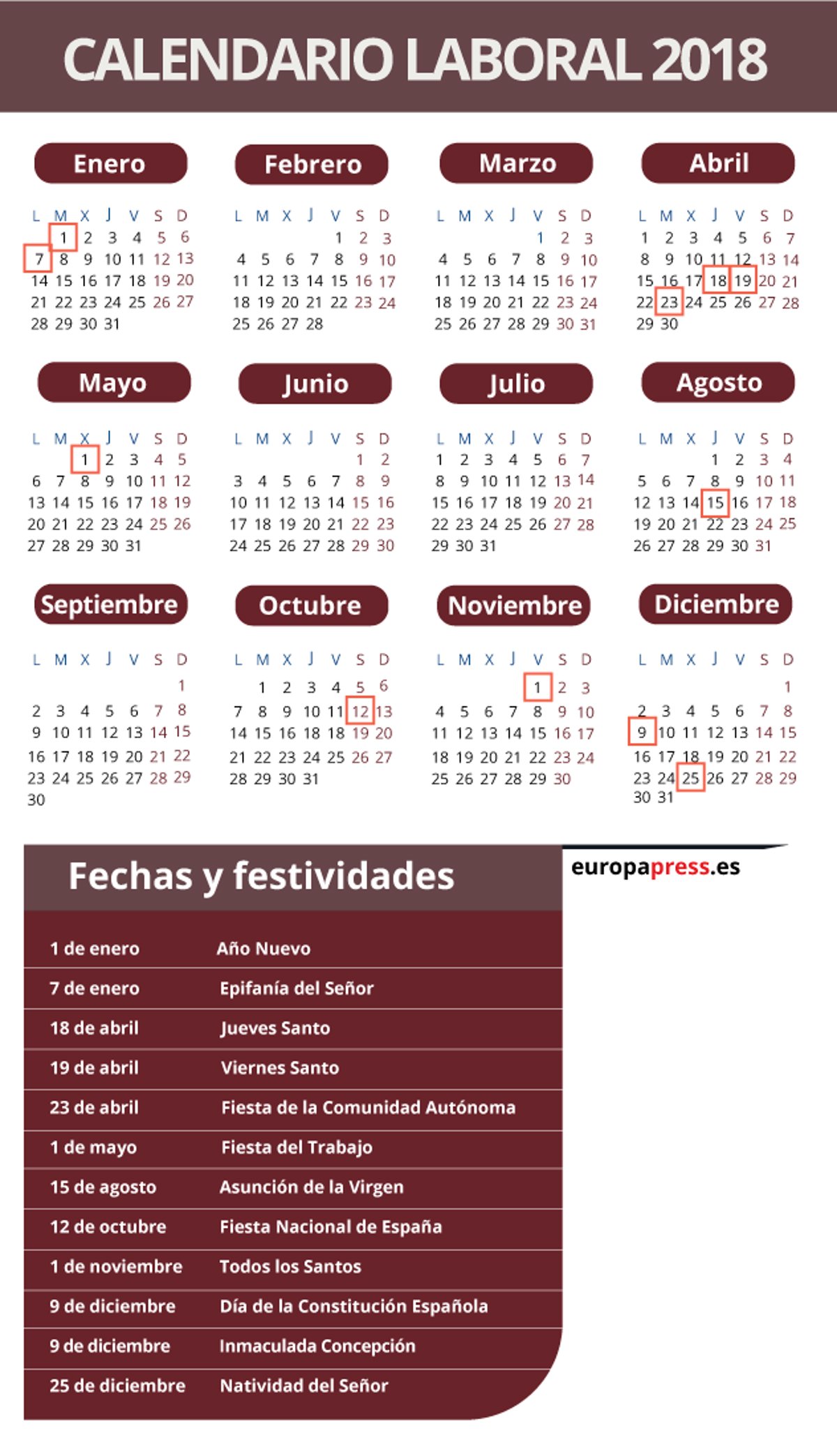 El calendario de fiestas laborales de 2019 se completa con el viernes 6 de diciembre, Día de la Constitución Española; el 8 de diciembre, Inmaculada Concepción, que se traslada al lunes día 9, y con el 25 de diciembre, Natividad del Señor, que caerá en miércoles.
