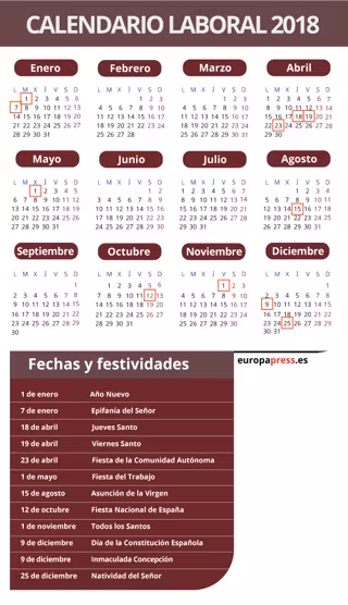 De este modo, las fiestas laborales, con carácter retribuido y no recuperable en el ámbito de la Comunidad para 2019 serán el martes 1 de enero, Año Nuevo; el domingo 6 de enero, Epifanía del Señor, que se traslada al lunes 7, y los días 18 y 19 de abril, Jueves y Viernes Santo.