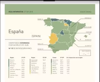 Según este barómetro, España está a la cola de Europa y se sitúa en el puesto 32 de los 88 países no angloparlantes de todo el mundo estudiados en el ranking EF EPI 2018, que evalúa el dominio del inglés en los adultos. Con una puntuación de 55,85, España se encuentra a la cola de los países europeos, superando por poco a Italia (55,77) y Francia (55,49).