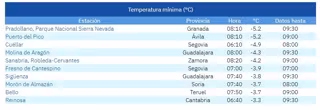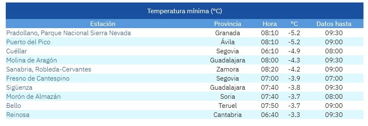 En cuarta posición está Molina de Aragón (Guadalajara), con -4,3 grados; seguida de Sanabria Robleda Cervantes (Zamora) con -4,2; Fresno de Cantespino (Segovia), con -3,9; Sigüenza (Guadalajara), con -3,8; Morón de Almazán (Soria) y Bello (Teruel), con -3,7, y Reinosa (Cantabria), con -3,3.
